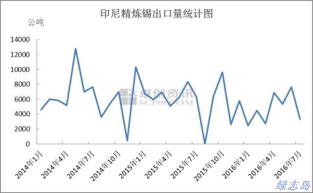 受印尼出口政策的影響,近幾年,印尼的精錫出口量逐漸降低,2016年7月印尼精煉錫出口量為3313.05公噸,較上月減少了4338.79公噸,環(huán)比減少56.70%,較去年同期減少3016.87公噸,同比下降47.66%。2016年1-7月總出口量為32963.5公噸,較去年同期減少12723.6公噸,同比下滑27.85%。如此大幅度的下滑,很大程度上牽制了全球精煉錫的供應,使得倫錫庫存持續(xù)處于低位。截止今年8月末,倫錫庫存為4460公噸,較去年同期減少2520公噸,同比下降36.10%。