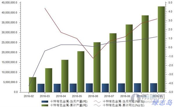 2016年10月十種有色金屬產量455萬噸,當月同比增長3.2%;1-10月累計產量4319萬噸,累計同比增長1.2%。